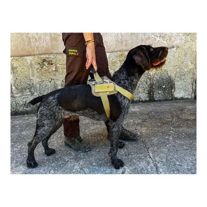 Arnés Bordado diseñado especialmente para perros de trabajo, equipado con bordado Guarda Rural para una identificación clara y profesional durante tareas de campo o patrulla.