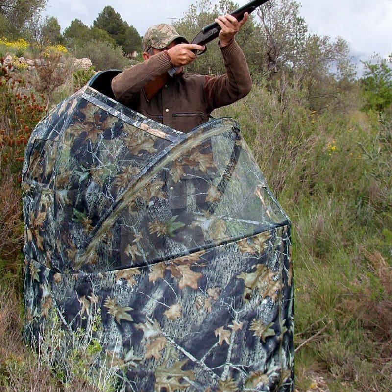 Tejido poliéster estampado con recubrimiento de PVC, IMPERMEABLE, cómodo, reducido tamaño, partes de tejido y partes de malla estampada, ventanas en los laterales y parte trasera con opcion de cierre, cremallera para facilitar la entrada y salida del perro, bolsillos interiores para munición, incluye mochila para su transporte.